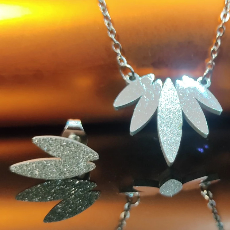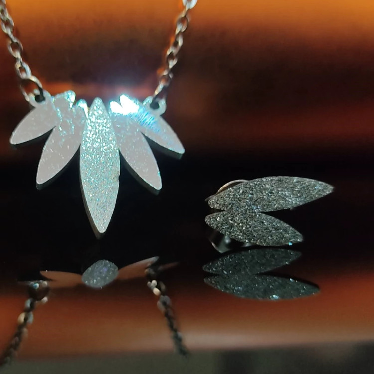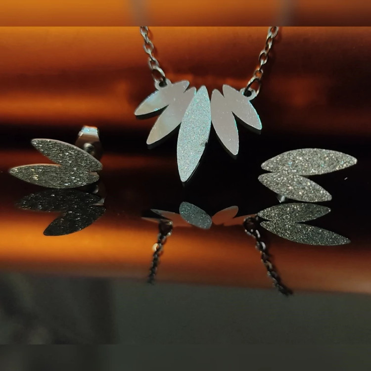 نیم ست دخترانه برگ نقره ای شامل گردن آویز زنجیر و گوشواره (گلگوش). طراحی چشم گیر و ترکیب نقره ای براق و سند پلاست زیبایی خاصی را به این کار بخشیده