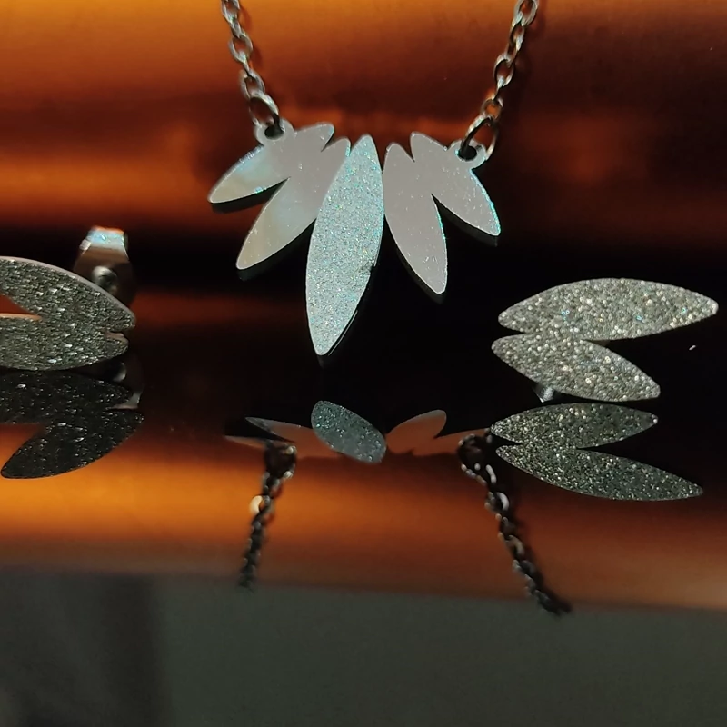 نیم ست دخترانه برگ نقره ای شامل گردن آویز زنجیر و گوشواره (گلگوش). طراحی چشم گیر و ترکیب نقره ای براق و سند پلاست زیبایی خاصی را به این کار بخشیده